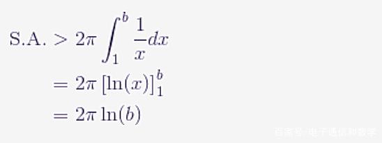 Gabriel 喇叭是 $y=1/x$ 在 $[1, +∞)$ 上的图象沿 $x$ 轴旋转一周所形成的旋转体。这个简单的三维图形有一个奇特的性质:它的表面积无穷大,却只有有限的体积。为了证实这一点,只需注意到: