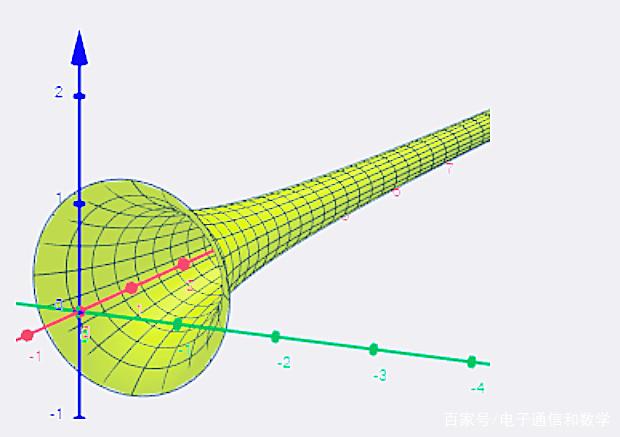 我们围绕 $x$ 轴在 $3$ 维上旋转该区域,最后得到一个(无限长的)类似角的对象。