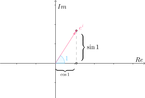 \[e^{i}=\cos 1+i\sin 1\]画出来就是复平面上模长为 $1$,幅角也为 $1$ 的点: