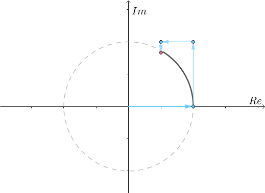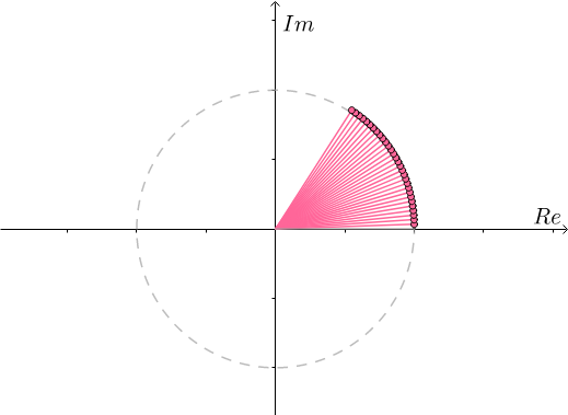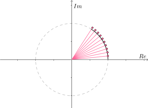 \[e^{i}=\lim_{n\to\infty}\left(1+\frac{i}{n}\right)^n\]我们来看看这个式子在几何上有什么意义。因为 $e^i$ 对应的是单位圆上幅角为 $1$ 的点,所以先给个参照物,虚线是单位圆,实线对应的幅角为 $1$: