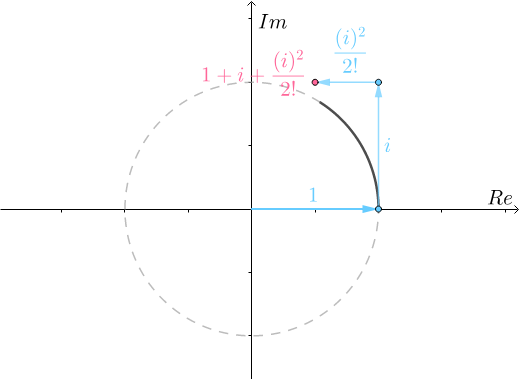 \[\begin{aligned} e^{i\theta} & = 1 + i\theta + \frac{(i\theta)^2}{2!} + \frac{(i\theta)^3}{3!} + \frac{(i\theta)^4}{4!} + \frac{(i\theta)^5}{5!} + \frac{(i\theta)^6}{6!} + \frac{(i\theta)^7}{7!} + \frac{(i\theta)^8}{8!} + \cdots \\ & = 1 + i\theta - \frac{\theta^2}{2!} - \frac{i\theta^3}{3!} + \frac{\theta^4}{4!} + \frac{i\theta^5}{5!} - \frac{\theta^6}{6!} - \frac{i\theta^7}{7!} + \frac{\theta^8}{8!} + \cdots \\ & = \left( 1 - \frac{\theta^2}{2!} + \frac{\theta^4}{4!} - \frac{\theta^6}{6!} + \frac{\theta^8}{8!} - \cdots \right) + i\left(\theta-\frac{\theta^3}{3!} + \frac{\theta^5}{5!} - \frac{\theta^7}{7!} + \cdots \right) \\ &=\cos\theta + i\sin\theta \end{aligned}\]这也有漂亮的几何意义,看看 $e^i$ 的前三项: