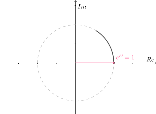 \[\frac{\mathrm{d}}{\mathrm{d}t}e^{it}=ie^{it}\]假设 $t$ 是时间,那么 $e^{it}$ 是运动在复平面上的点的位移函数,$t=0$ 时位置为 $e^{i0}=1$: