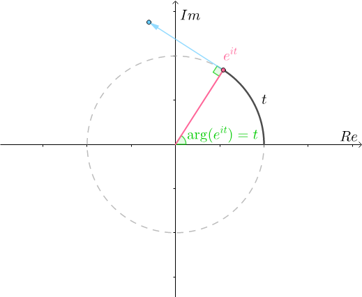 \[\vert ie^{it}\vert =1\]速度大小为 $1$ 意味着 $t$ 时刻走了 $t$ 长度的路程。而 $e^{it}$ 在单位圆上运动,那么 $t$ 时刻运动了 $t$ 弧长,因为是单位圆,所以对应的幅角为 $t$: