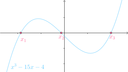 \[x^3-15x-4=0\]从图像上看,$x^3-15x-4$ 与 $y=0$ 有三个交点的: