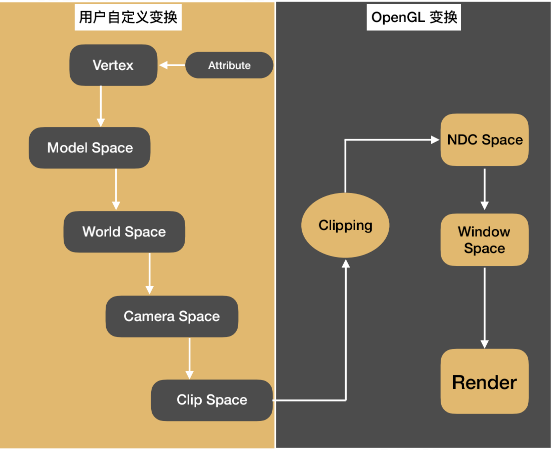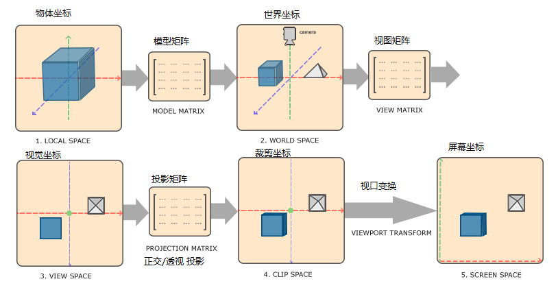 在上图中,OpenGL 定义了后三个坐标系(裁剪坐标、NDC 坐标、屏幕坐标),前三个坐标(物体坐标、世界坐标、摄像机坐标)是为了用户方便而自定义的坐标。