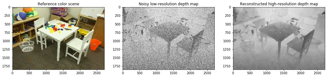 Artifial noise addition and downsampling of the depth map, followed by interpolated upsampling. 添加了人工噪点和下采样的深度图,然后插值的上采样。