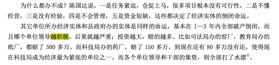 他当时包的一个村在河滩里养了几 头牛,在这个基础上,就在河滩里盖了一个养牛场,立了很多牛槽,号称百头养牛场,其实就 5 头 牛。遇到检查的时候,就从其它村里雇牛,检查后,再还。他说这也没有办法,因为大家都知道, 集体投资养,肯定养不成,但上面的检查也要应付。所以一遇到检查,等于是全县猪羊牛大迁移, 满路跑的猪羊牛,很是壮观。这种造假风气,一直延续到今天。具有讽刺意味的是,这种造假反而 起到了减少损失的作用。
