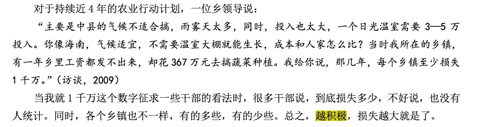 • P141 所以一遇到检查,等于是全县猪羊牛大迁移,满路跑的猪羊牛,很是壮观。这种造假风气,一直延续到今天。具有讽刺意味的是,这种造假反而起到了减少损失的作用。