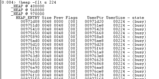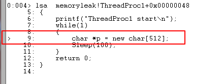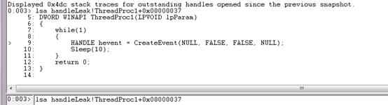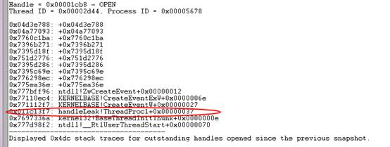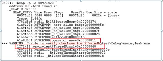!heap -flt s 224 ,查看 224 这些块被谁在使用!heap -p -a 00971d20 ,查看堆栈lsa memoryleak!ThreadProc1+0x00000048