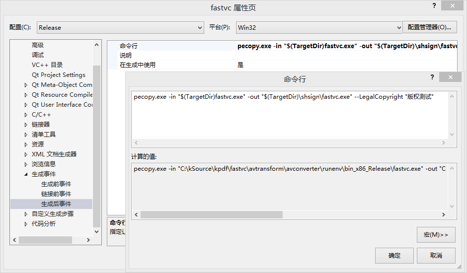 3. 配置生成后事件(一般根据工程当前的工程目录然后找到 pecopy.exe 的相对路径):