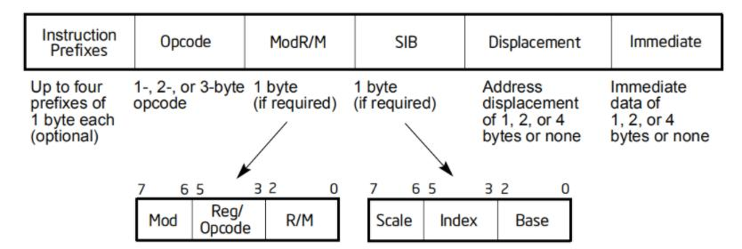 反汇编过程即二进制转汇编助记符,参考 intel 指令集手册。 X86 为变长指令(灵活),arm 为定长指令(高效)[ 4G 寻址问题 ]