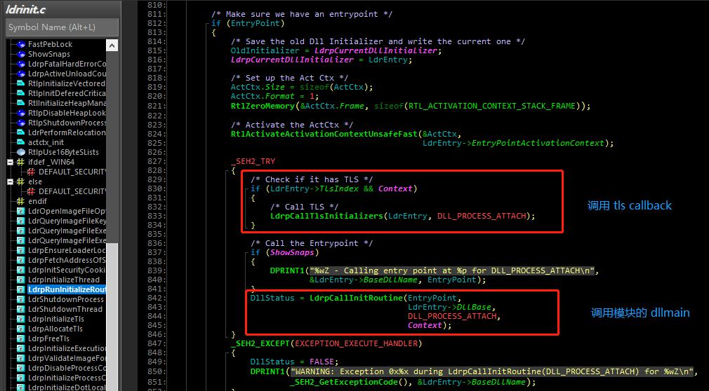 进程的首个线程(进程初始化)ntdll!_LdrpInitialize –> ntdll!LdrpInitializeProcess –> ntdll!LdrpRunInitializeRoutines –> ntdll!LdrpCallInitRoutine TLS 回调比模块的 dllmain 执行时机更早