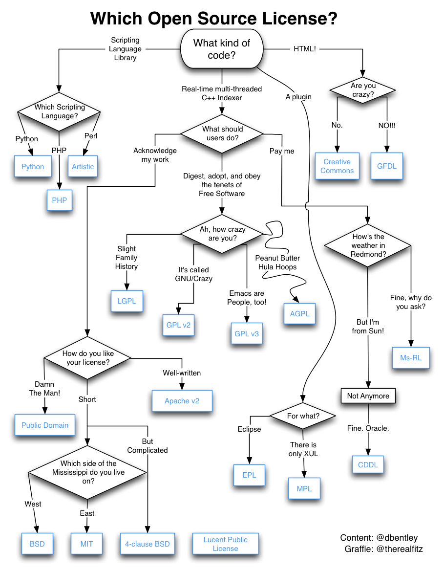 乌克兰程序员 Paul Bagwell 画了一张分析图,说明应该怎么选择开源协议,大家看了一目了然,真是清爽。 图片来自于阮一峰博客:如何选择开源协议