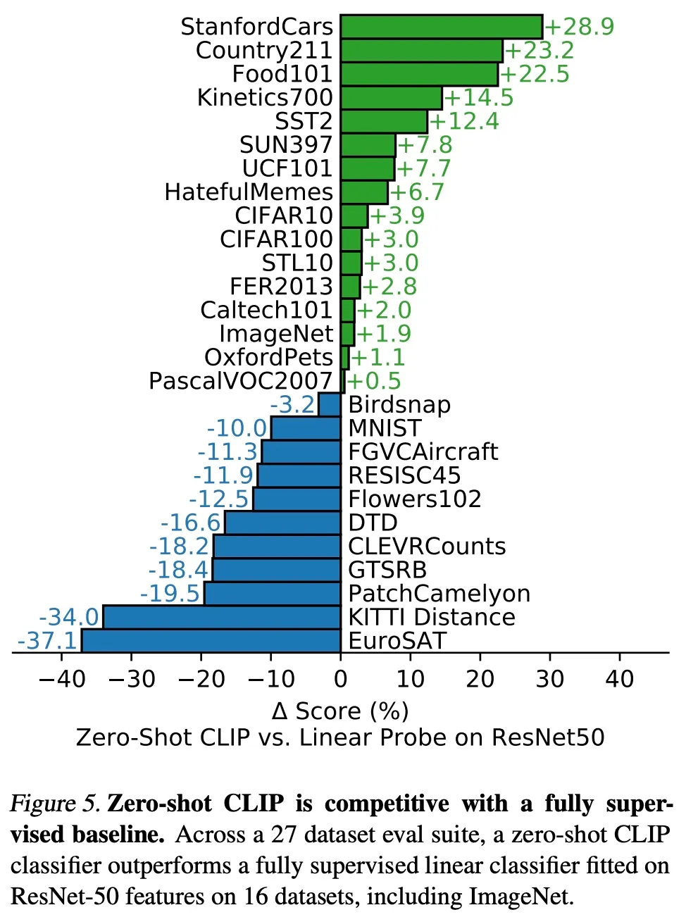1:38:26 我个人感觉,4 亿张图片的训练集就肯定或多或少包括了那 30 类数据集中相似的图片,就像 LLM 那种,我感觉这些 zero-shot 就其实都是早就 train 过的原因。