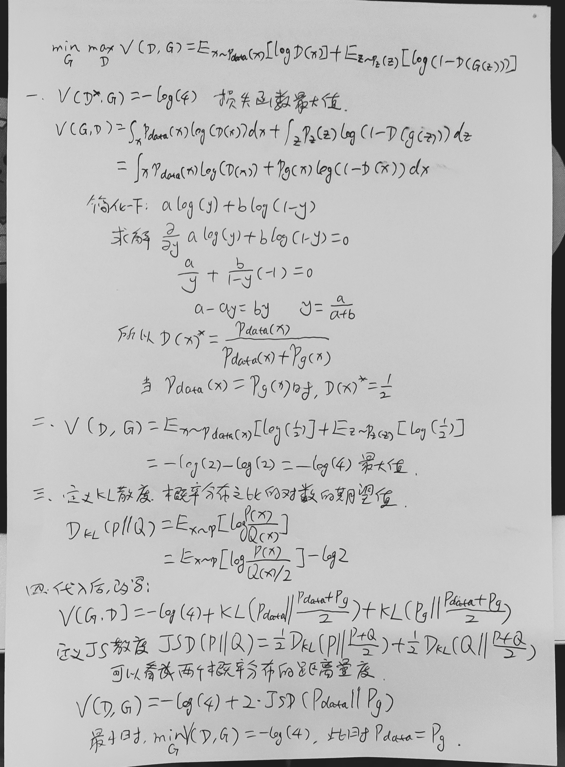 \[V(G, D) = - \log(4) + KL(\frac{p_{data} + p_g}{2} || \frac{p_{data} + p_g}{2}) + KL(\frac{p_g}{2} || \frac{p_{data} + p_g}{2}) \\ \text{ 设 JS 散度 } JSD(P||Q) = \frac{1}{2} D_{KL}(P||\frac{P+Q}{2}) + \frac{1}{2} D_{KL}(Q||\frac{P+Q}{2}) \\ \text{ 可从容地看出散度表示了这两个分布的重合度量。}\] \[V(G, D) = - \log(4) + 2 JSD({p_{data}} || {p_g})\]最终目标,$\min_G V(D, G) = - \log(4)$,当且仅当 $p_{data} = p_g$。