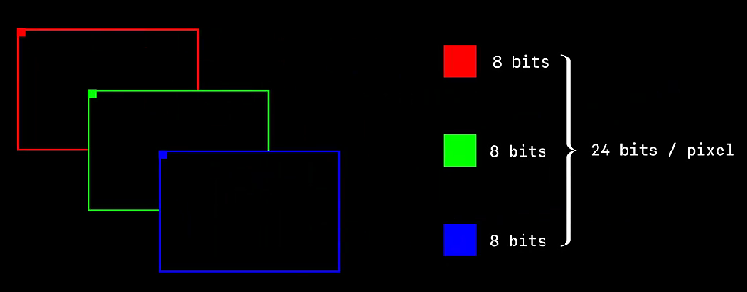 我们知道,常见的图像是由 RGB 格式组成,图像上的每个像素值分别由 R(8bit)G(8bit)B(8bit) 表示,如下图所示: