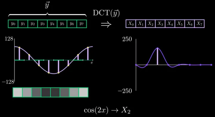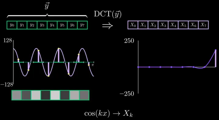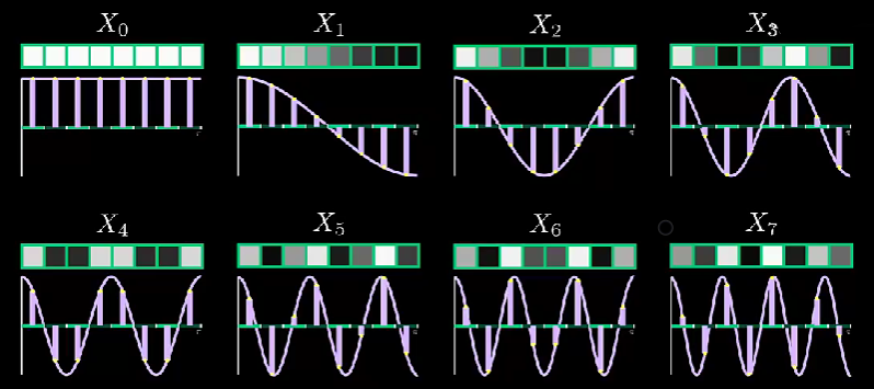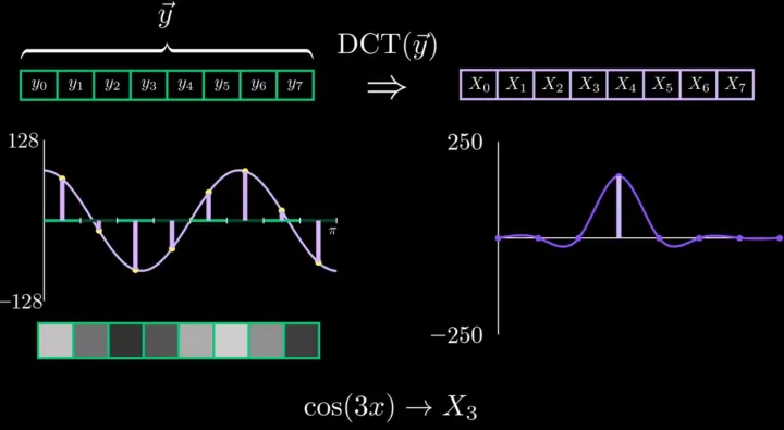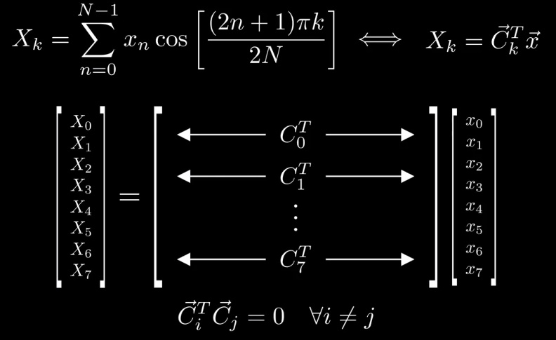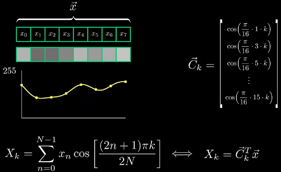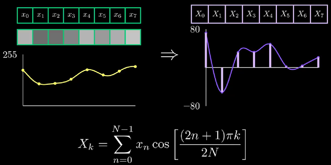 因此,我们也可以得到:8 个像素值的所有组合,均可以表示为该 8 个余弦函数的总和。这里我们分析一下,对于任意的 8 个像素值组合,其对应的下面的 DCT 变换如下,其 Xk 求解形式如下: