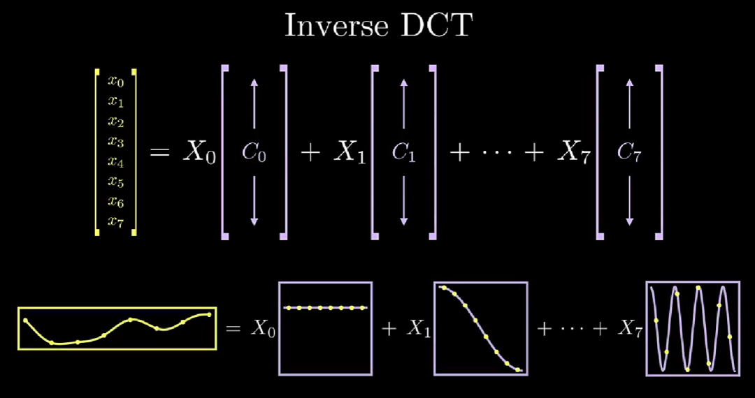 我们将 Inrerse DCT 拆开写,更清楚的显示任意信号和对应的标准余弦信号组合关系: