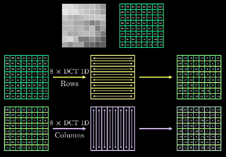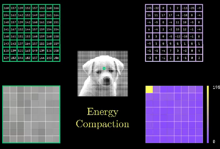 在 JPEG 算法中,图像被分为了 8*8 的像素组,每个像素组用自己的离散余弦变化进行频域编码。为什么选用 8*8 的像素组。采用比 8*8 更大的像素组,会大幅增加 DCT 的运算量,且编码质量也不会明显提升;采用比 8*8 更小的像素组会导致分组增多降低精度。所以 8*8 的像素组是效率最优的结果。对每个像素组组,我们都用上述 DCT 进行变换。
