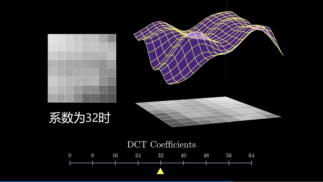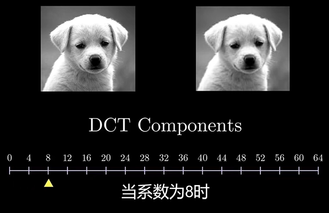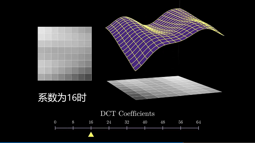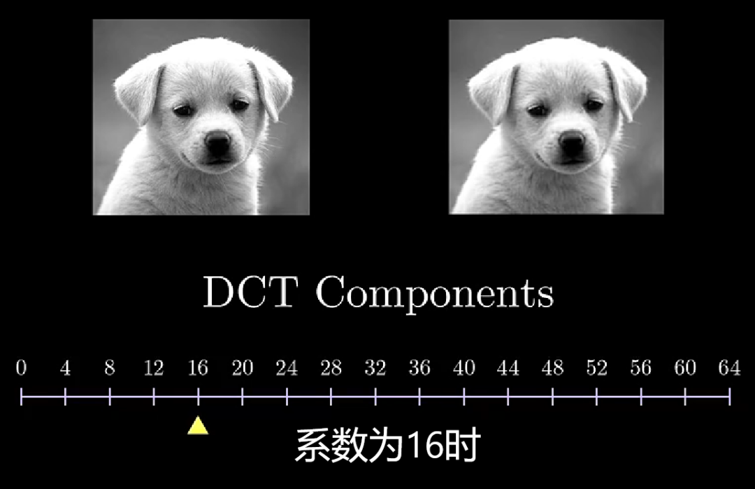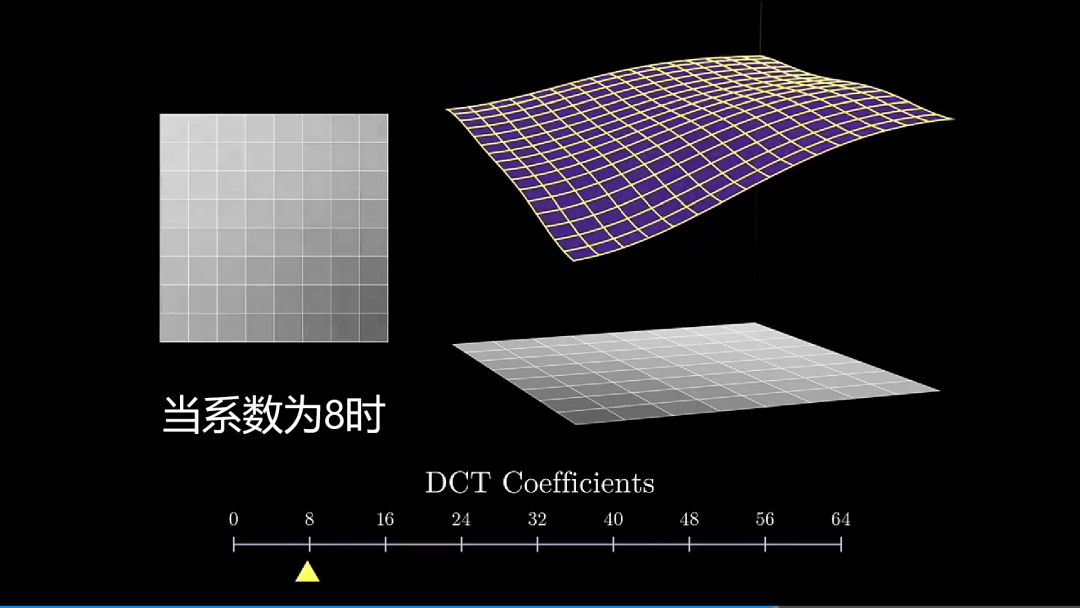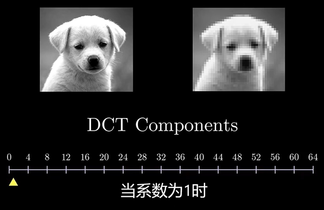 当系数为 0 时,恢复出来一片白板;只用一个系数时,图像大体轮廓已出现;加入 8 个频率时,图像基本上恢复出原样;加入 16 个频率时,图像越来越清楚。随着后续高频不断加入,图像并没有多大改变,此时,我们就可以丢弃 DCT 的高频分量了。