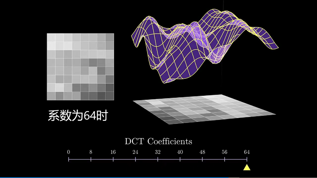 由于 DCT 具有可逆性,也就是说,根据 DCT 2D 得到的变换矩阵,我们可以完整反推出对应的像素值,我们可以把 64 个系数从低频到高频依次加入,其图像的变换情况: