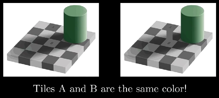 研究人员通过大量实验证明,人类视觉系统对亮度的更敏感,而对颜色没那么敏感,如下图所示,A 和 B 其实是一种颜色。