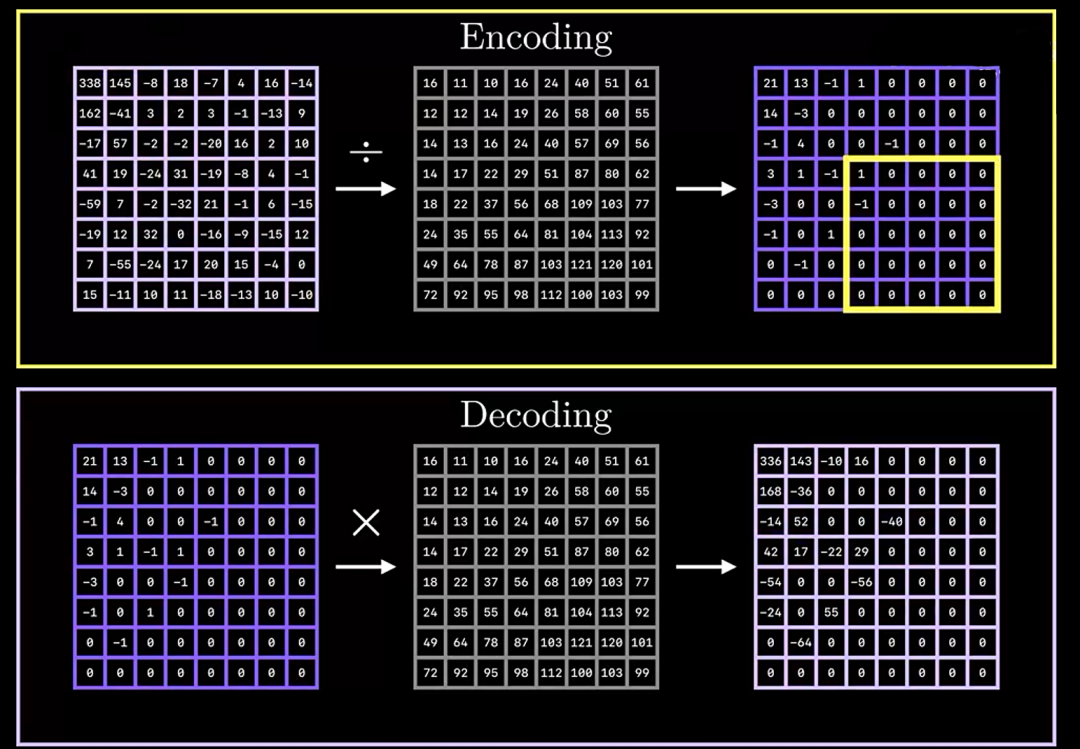 将 DCT 2D 变换得到表格(上面 Encoding 中左边)与量化表格进行逐元素触发,得到右边蓝色表格, 可以发现,变成一个稀疏矩阵,同时,也注意到一个事情,如下图所示,DCT 2D 得到的系数矩阵, 其左上角最大,低频信息集中在左上角区域,而高频部分则集中在右下角部分(低频信息,对应的 DCT 系数矩阵其能量系数也大)。这个性质其实可以从 DCT 2D 的推理过程可以得到。在上述经过量化后的系数矩阵中,右下部分出现大量的 0,也就意味着,该信号可以被舍弃。注意,舍弃高频信息的过程就是量化过程,这里会出现信息损失。