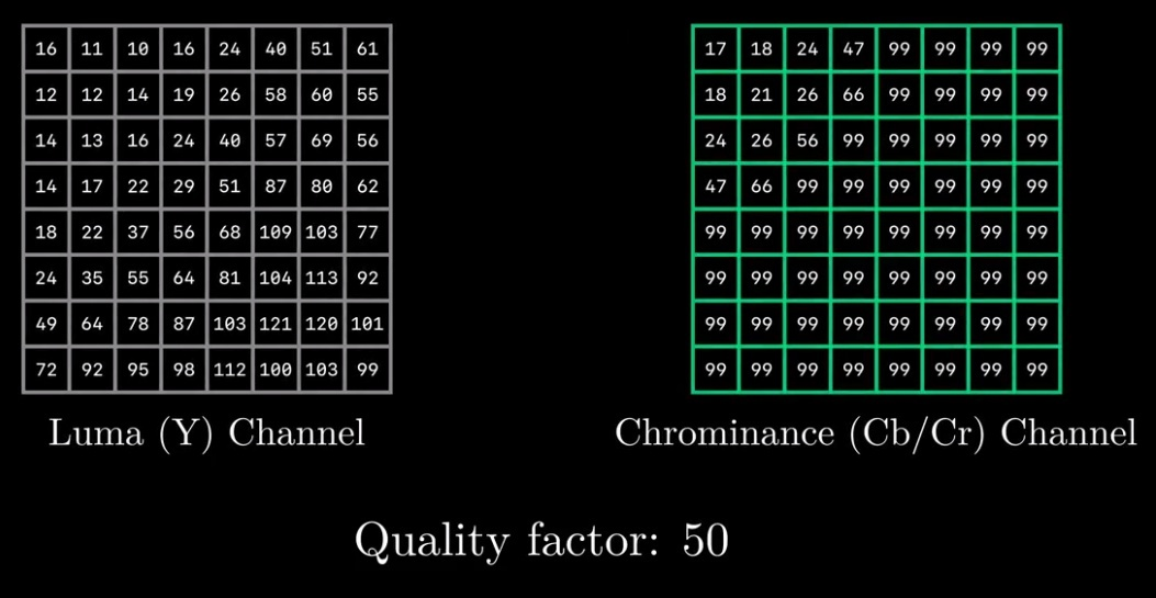 JPEG 压缩技术规定了不同 quality factor 下的量化值,QF 越大,量化表格里的数值就越小,其损失也就越小,同时,结合人眼对色彩的敏感要低于亮度,因此,对于 Y 和 CrCb, 定义了不同的量化系数。