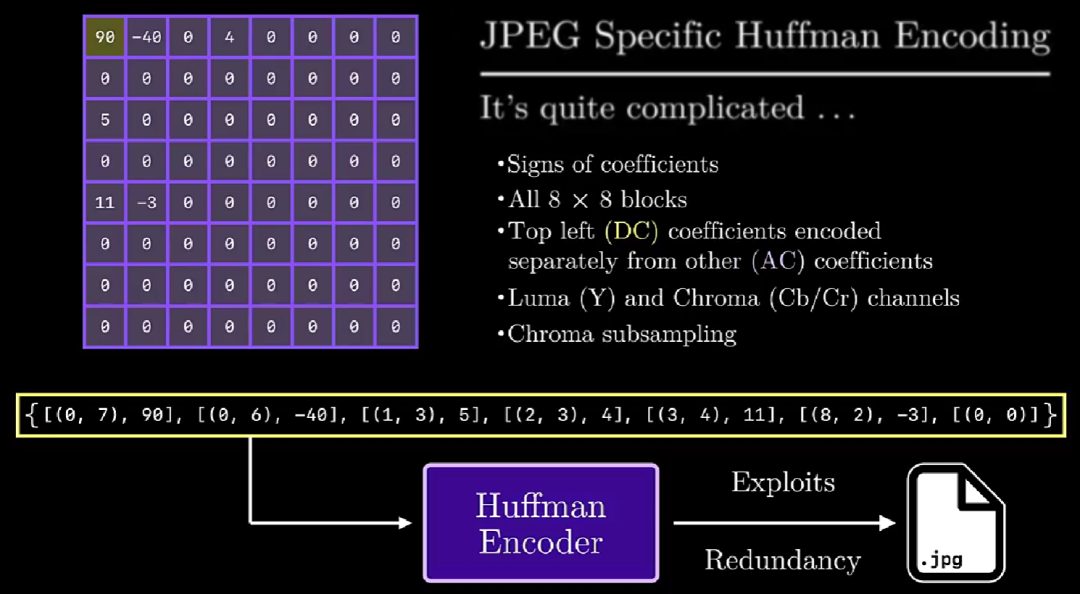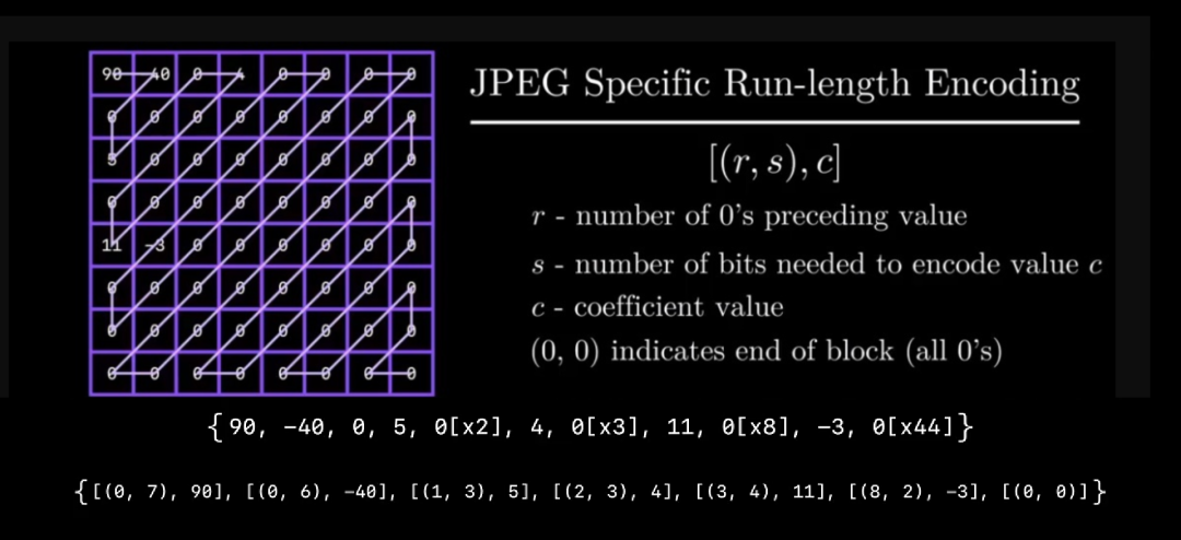 为了进一步对数据进行压缩,我们对经过量化后的稀疏矩阵进一步分析,采用游程编码 (ZigZag) 和霍夫曼编码组合手段,进一步减少信息存储,如下图所示: