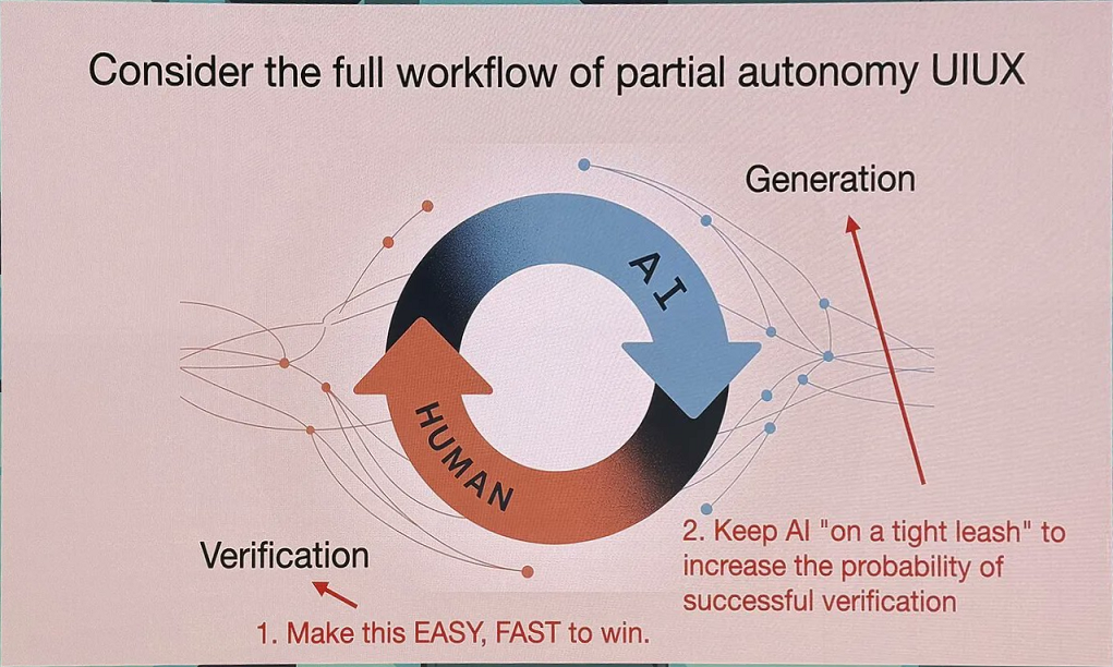 Karpathy 观察到,目前最有效和 AI 协作模式是“AI 负责生成,人类负责验证”,要让这个循环尽可能快速运转,有两个可以调整的方向: