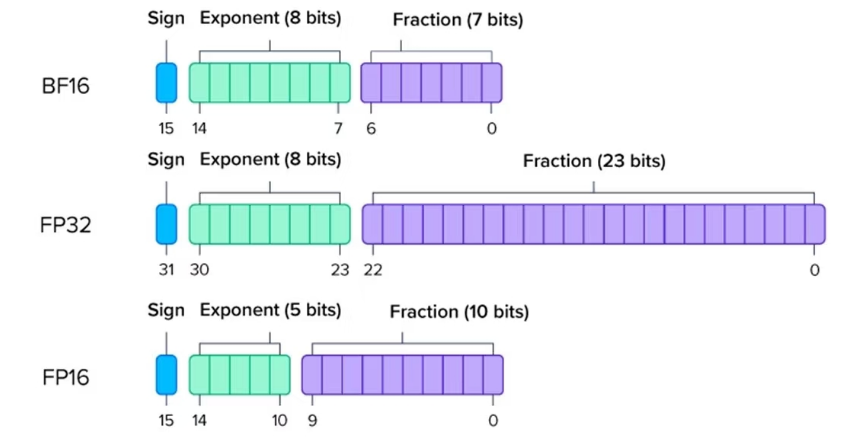 - 以 BF16 为例,1 位符号 + 8 位指数 + 7 位尾数 = 16 位